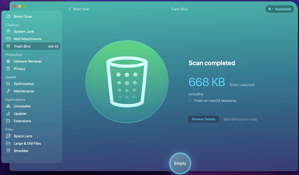The CleanMyMac has a Trash Bins feature to empty the trash bin. Of course, you don’t need a dedicated application to remove junk. You have a feature in the X edition.