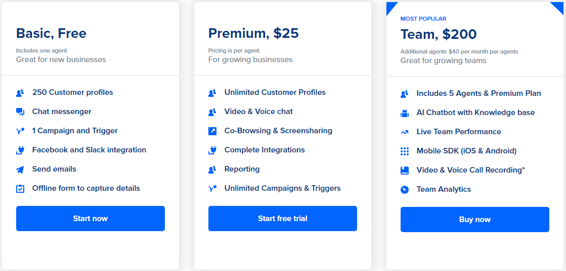 Another great thing about acquire.io is the free tools and free trails provided by them to get to know about their products before using them. The basic tools with limitations on customer profiles and limited features will come at free cost to the customers and it is best for new businesses to choose this plan before moving to premium plans. Others plans include premium plan and team plan which comes at $25 and $200 respectively. They both come with all extensive features and gives unlimited access. Premium is more suitable medium business and team for great growing teams with lot of agents.