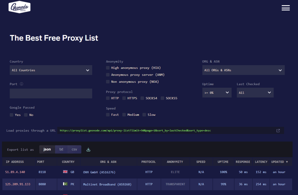 Geonode provides the best free proxy list on the net. All of our proxy packages support IP whitelisting and authentication with username + password. Your access point will interact with your software just like a regular proxy and all the hard work is done through our servers.