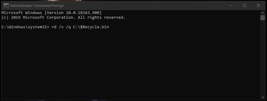 Step 2: Copy and paste (rd /s /q C:\$Recycle.bin) in the Command Prompt and hit enter.