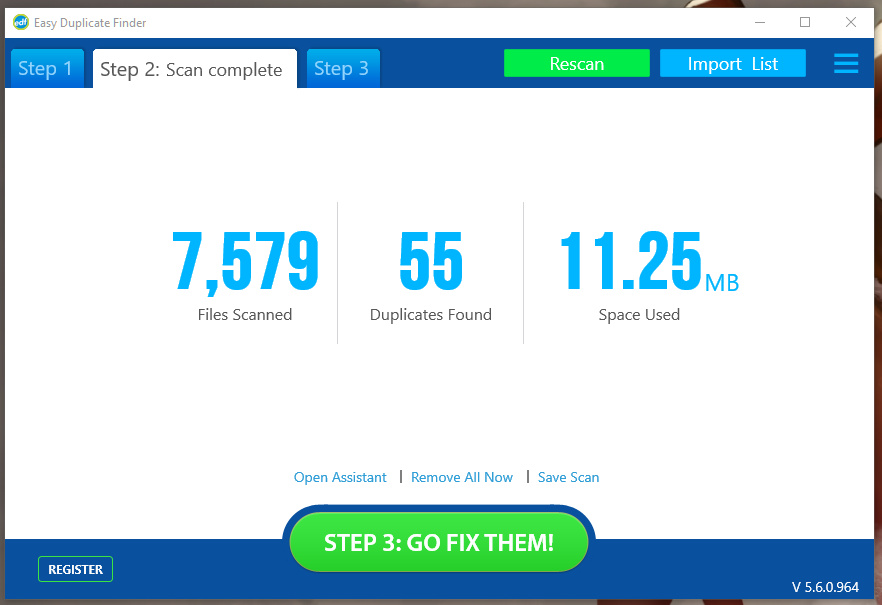 Step 2: Within a matter of seconds, the scan was completed with 7579 files scanned, 55 files were duplicate, and 11.5MB space consumed by the duplicate files.