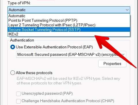 Setting up a successful VPN connection requires allowing the required protocols. The necessary protocols could be MS-CHAP v2, PAP, and CHAP.