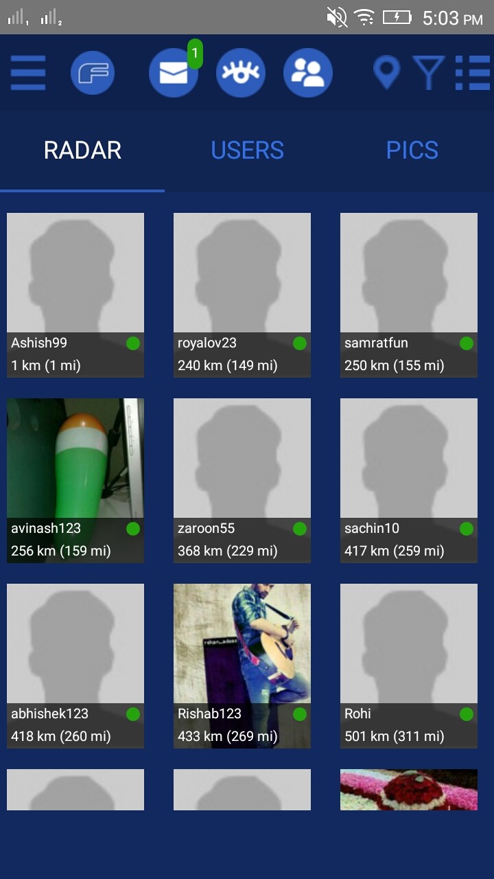 • After completing the registration,The home page welcomes you with a radar search option and you are able to check out the messages etc.