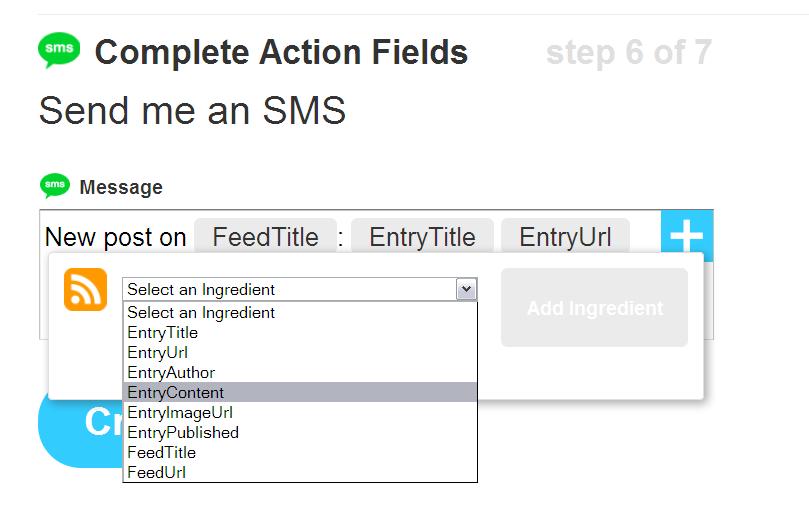 Step 11 : By default you can receive Feed Title, Entry Title and Entry Url of a particular post, if you want to receive the post content then just click + and select Entry content from the drop down menu then select Add ingredient .Check the screen shots below.