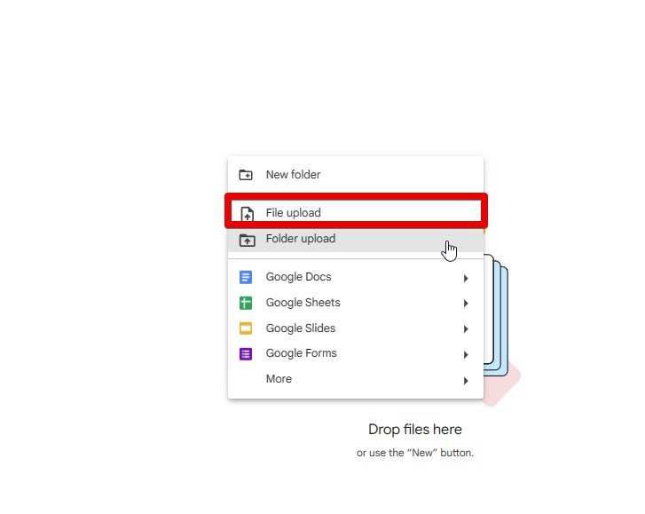- Inside one of the GDrive folder, right-click on the blank area and hit “File Upload”.