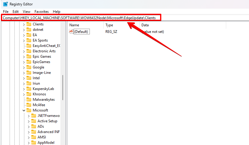 - In the Registry Editor, navigate through the folders in the left panel to reach HKEY_LOCAL_MACHINE\SOFTWARE\WOW6432Node\Microsoft\EdgeUpdate\Clients.