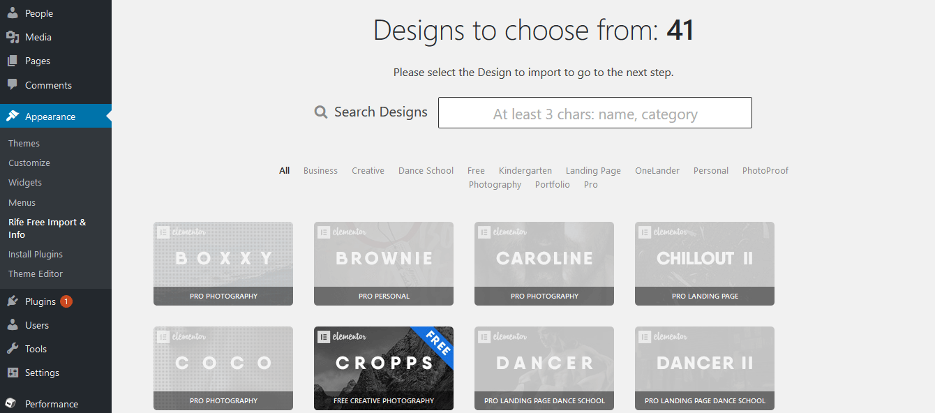 I have gone through the available existing designs from the list, and you can install them by purchasing the premium version. In the free version, you can install a few designs, which is good news because most of the companies allow one free design only. You can install Cropps, Unicorn, Woor, Star, Raven, Lander, and Frame design. The company targeted Photography, Portfolio, Creative portfolio, Business, and Landing page templates for free customers.